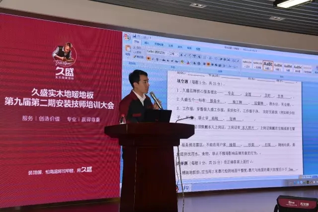 培訓(xùn)會(huì)上,久盛服務(wù)部部長趙京濤、CRM部部長莫越峰、產(chǎn)品管理部部長徐立合力為學(xué)員帶來一堂堂專業(yè)、生動(dòng)、有效的課程,濃厚的課堂氛圍提高了全員的學(xué)習(xí)興趣。每一位學(xué)員認(rèn)真聽取有關(guān)于“實(shí)木地暖地板安裝服務(wù)規(guī)范”、“實(shí)木地暖地板安裝標(biāo)準(zhǔn)”的理論知識(shí),且通過及時(shí)有效的一場模擬考試,鞏固已習(xí)得的寶貴財(cái)富,將“好服務(wù)”的精髓爛熟于心: